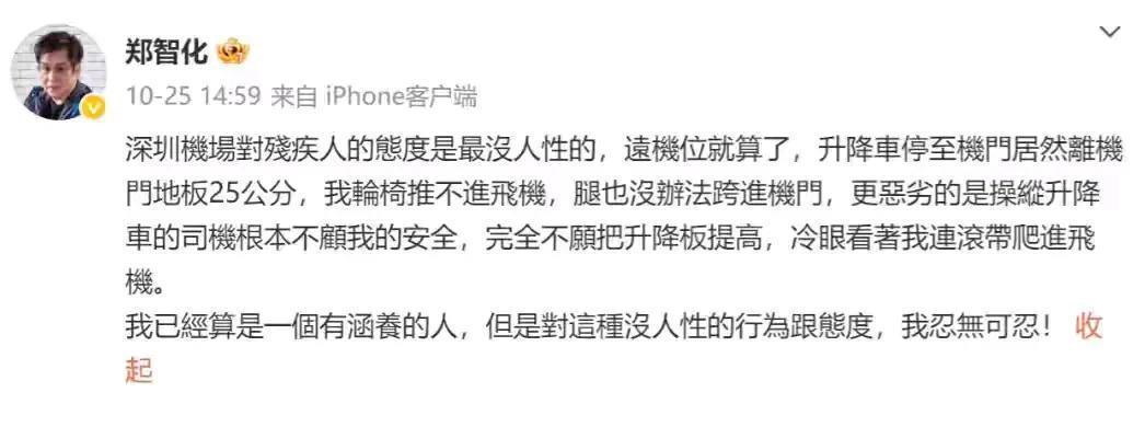 深圳机场廊桥与升降车之间二十五公分的缝隙,竟成了压垮老歌手郑智化网络生涯的最后一道鸿沟。2025年深秋,当这位63岁轮椅歌手在微博控诉“连滚带爬”登机经历时,绝不会料到短短十天,自己会清空全部微博内容黯然退场。更戏剧性的是,机场监控视频显示两名工作人员正小心翼翼搀扶他过缝隙——画面与他笔下“冷漠司机冷眼旁观”的描述形成荒诞对比。